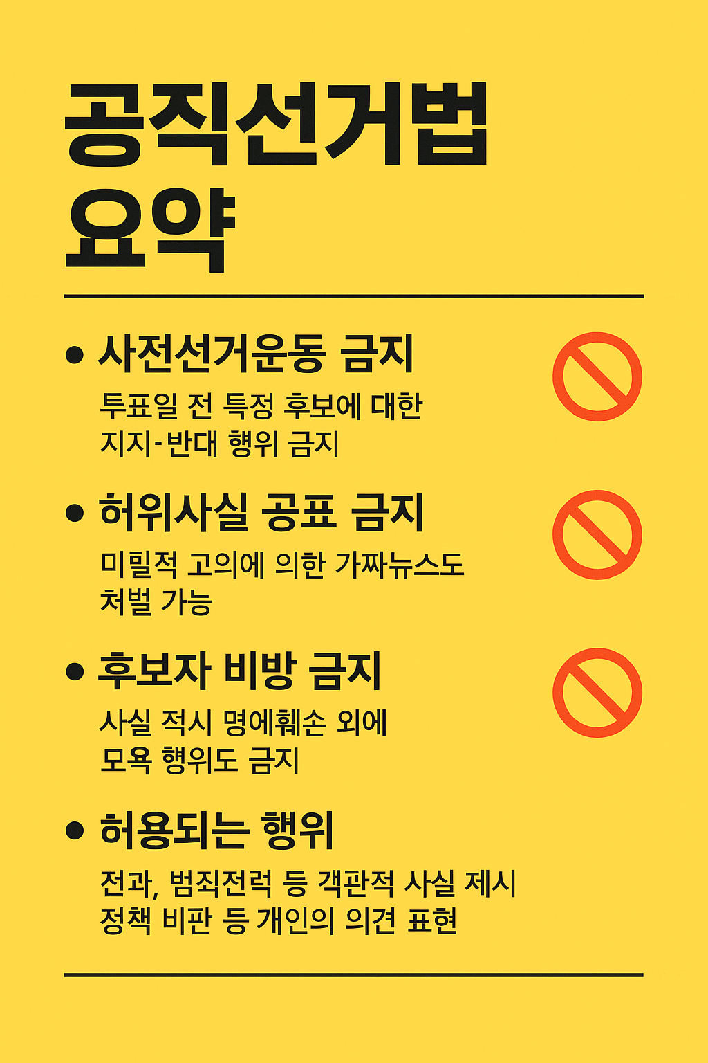 | ❌ 사전선거운동 금지 | 투표 전 특정 후보를 지지·반대하면 처벌 대상 |