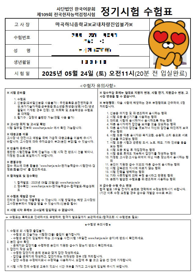 | ✅ 수험표 | 인쇄 필수 / 모바일 화면 불가 |