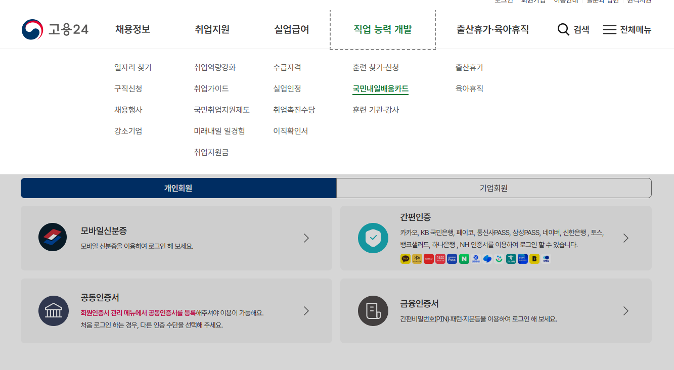 → ‘국민내일배움카드 신청’ 메뉴 클릭